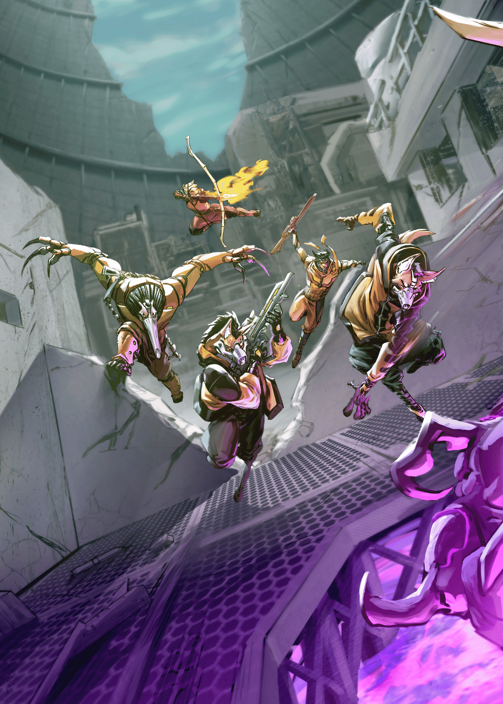 Com um sinal, eles entram pela porta central. Kaluanã é o primeiro, um guará’i de dois metros disparando todas as Vinte e Sete doze balas de sua pistola com a mão esquerda. Abaeté, um Tamanduá’i, adentra com uma espingarda de precisão nos braços mecânicos, Vinte e Seis, sua máscara anti-radiação comicamente grande em seu longo fuço, e suas poderosas garras alongadas prontas para perfurar.